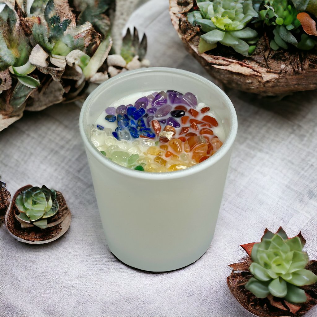 Otroligt fina Chakra-doftljus i matt vitt glas.