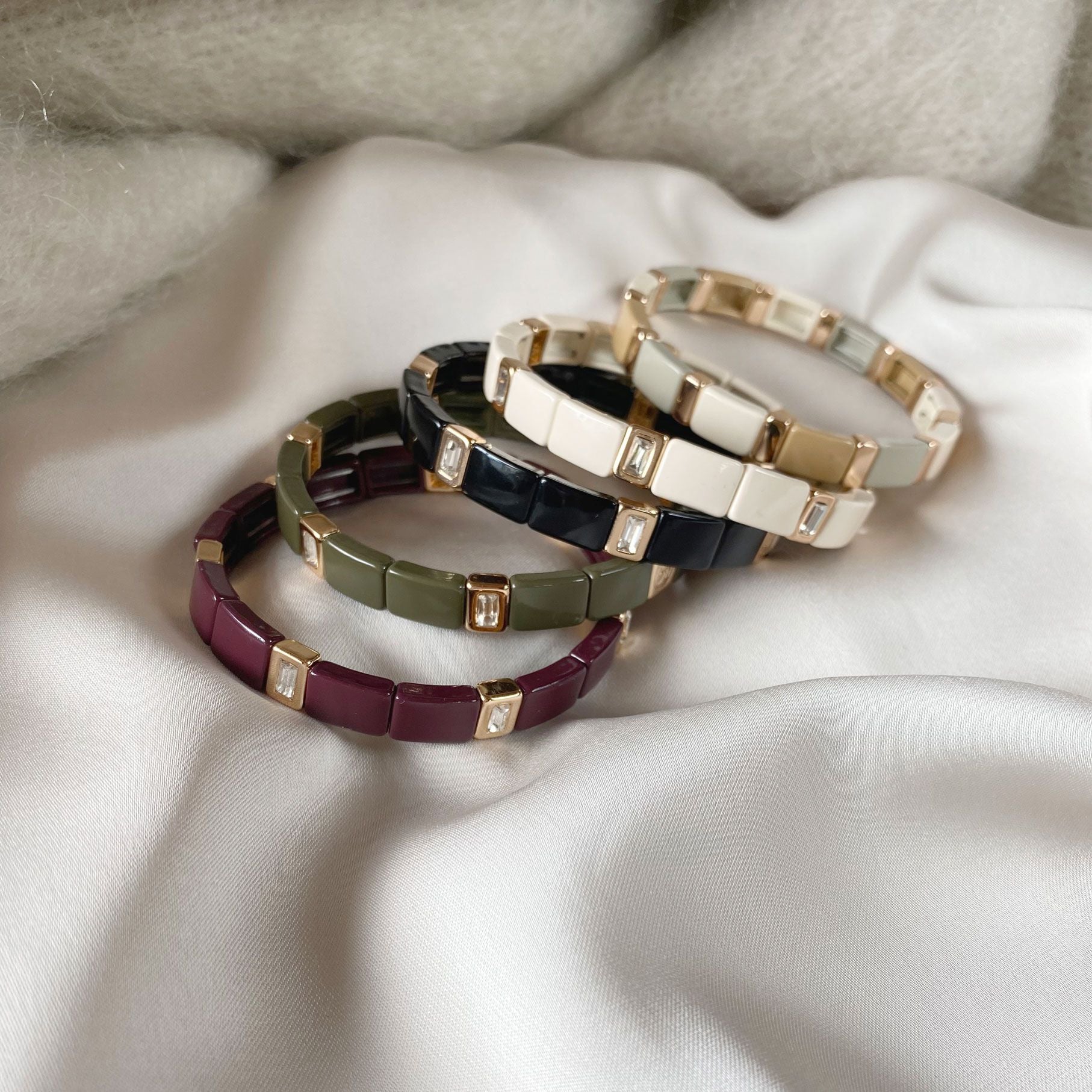 Elegant armband med gräddvita emaljplattor, gulddetaljer och strass.