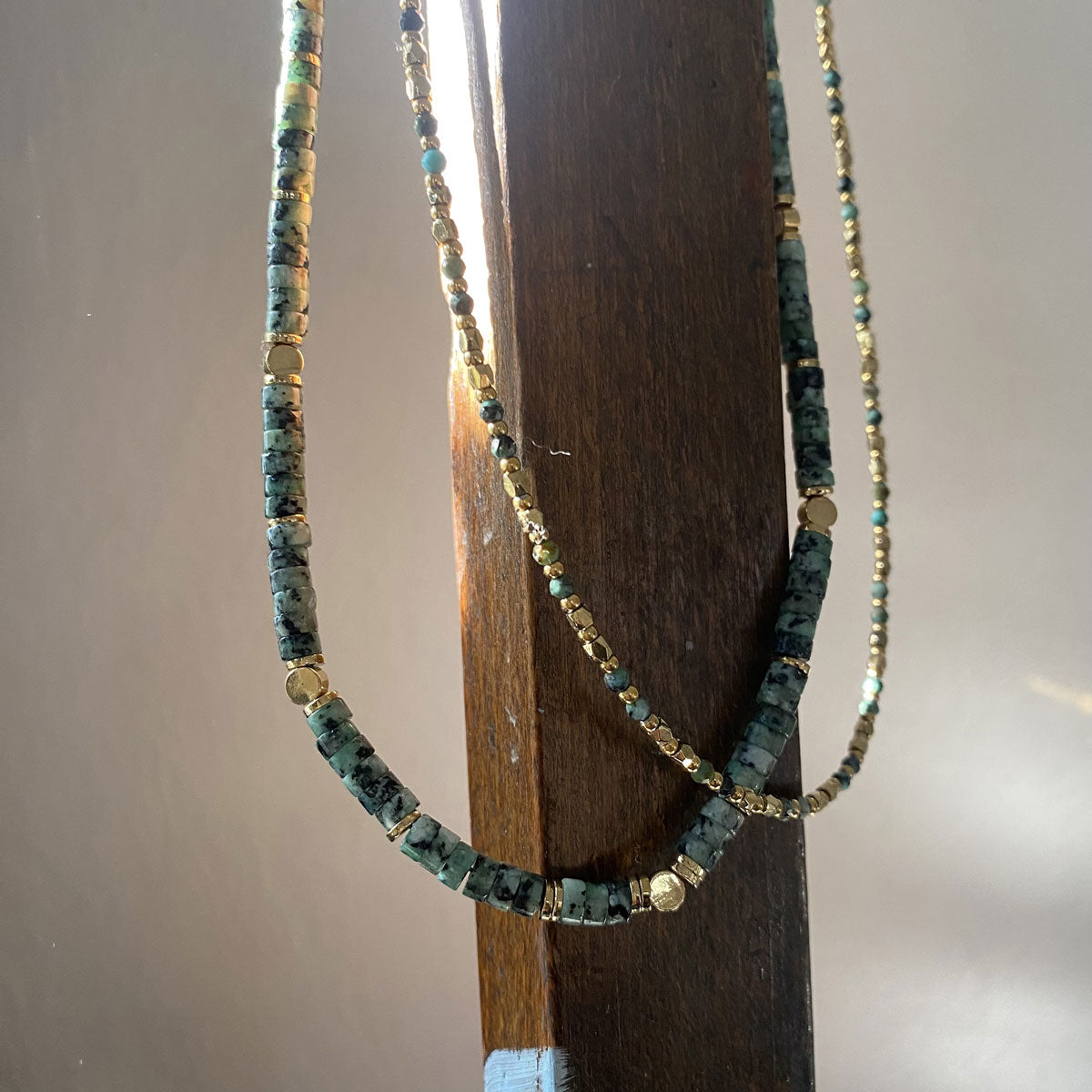 Den naturliga variationen hos de gröna stenarna gör varje smycke unikt