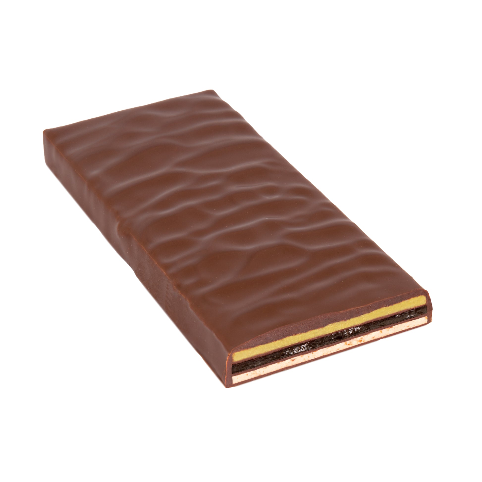 3 delikata lager: ett fruktigt lager av hemgjord mandaringelé på ett lager av kokospralin, som har fått extra krisp av karamelliserad, riven kokos. Toppat med ett grönt matcha-lager, som består av vit rischoklad och grönt te.