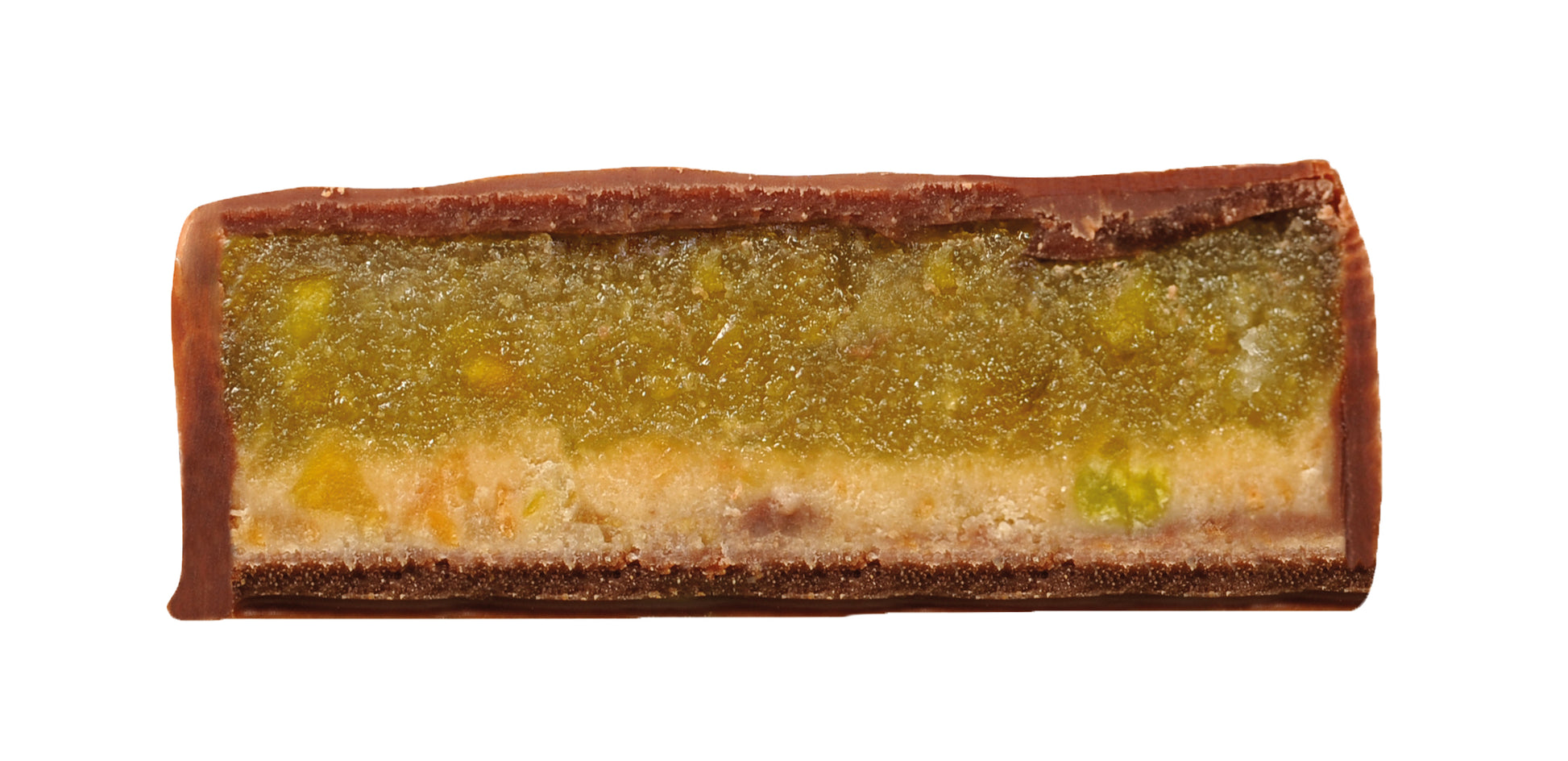 Pistaschnötter, det allra bästa från Iran, kan nu avnjutas i form av en delikat chokladkaka med två lager: ett med pistaschmarsipan som har smaksatts med ett aniste och ett med mandelpralin. Båda lagren omges av en aromatisk mörk mjölkchoklad.