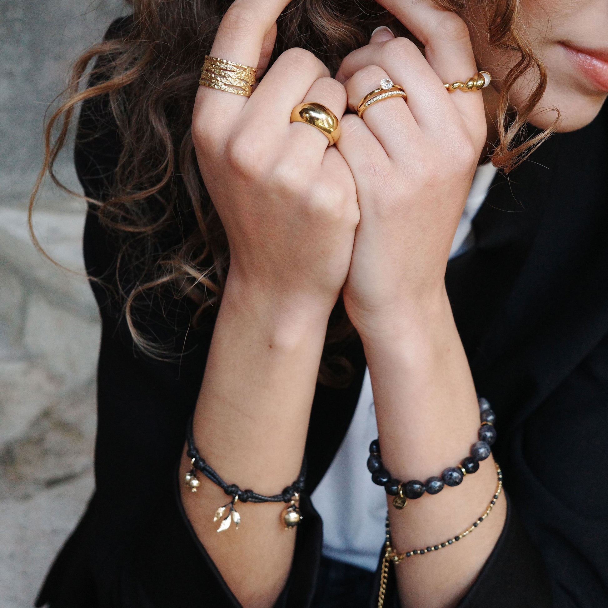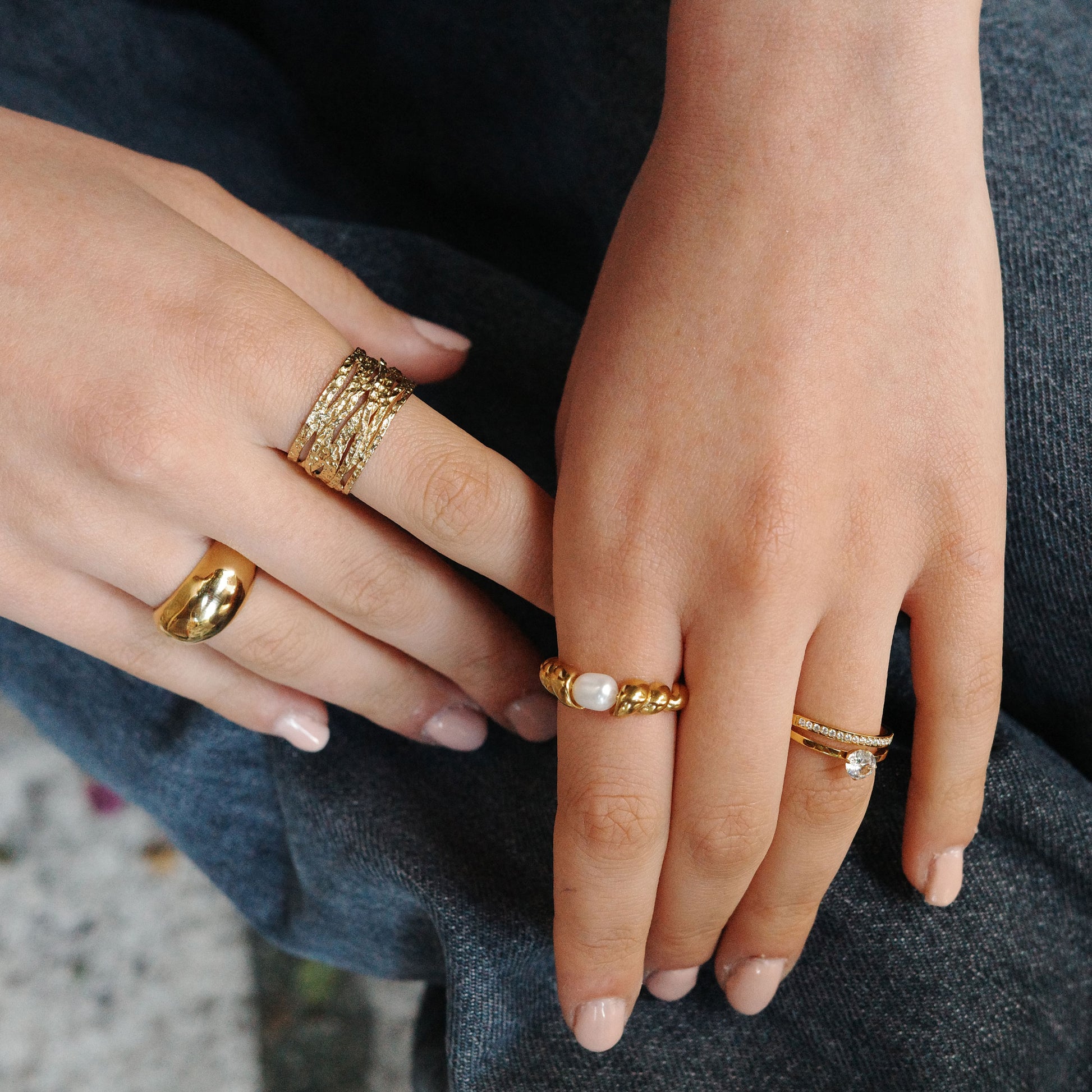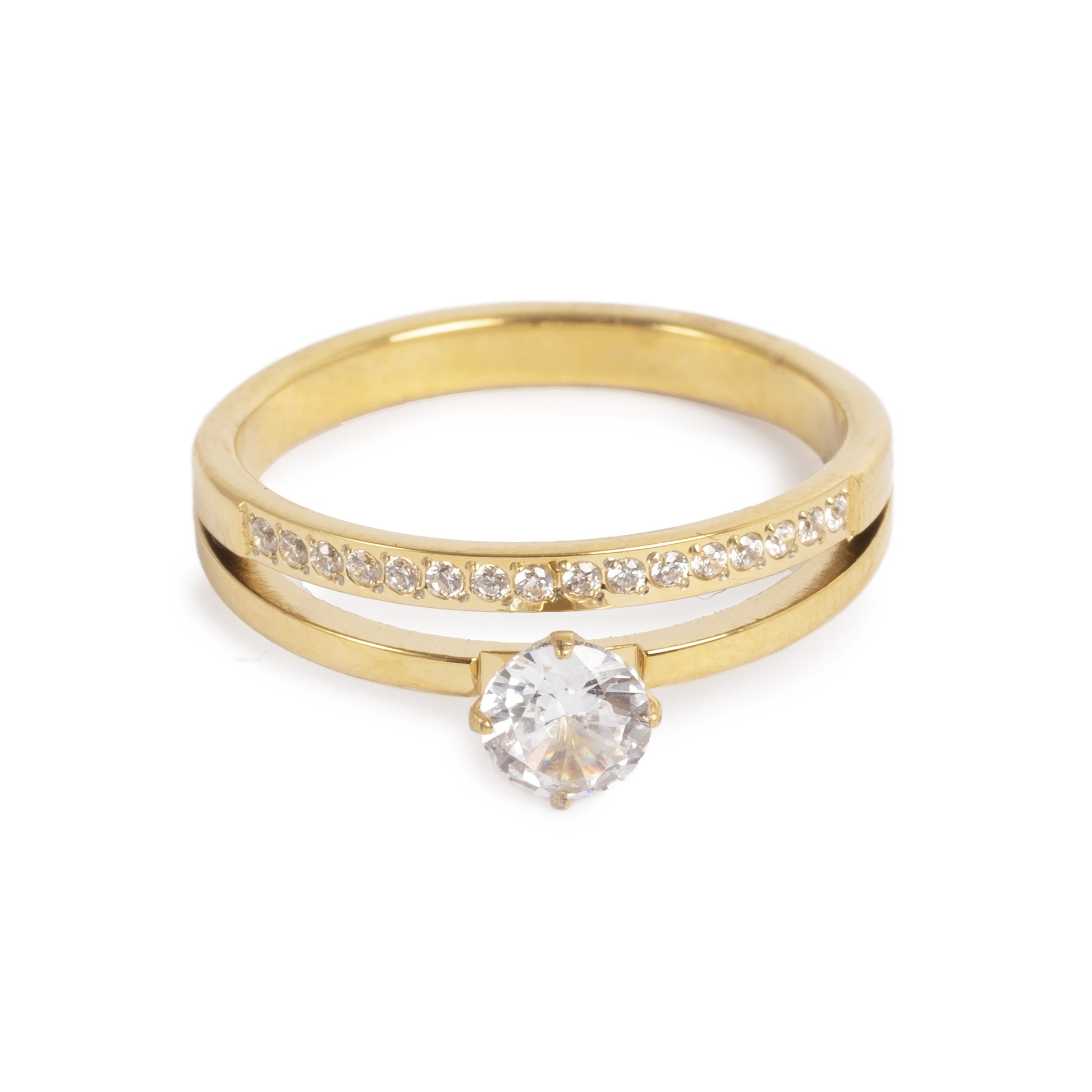 Ringen är tillverkad i guldpläterat stål, vilket ger både långvarig glans och ett exklusivt utseende på samma gång.